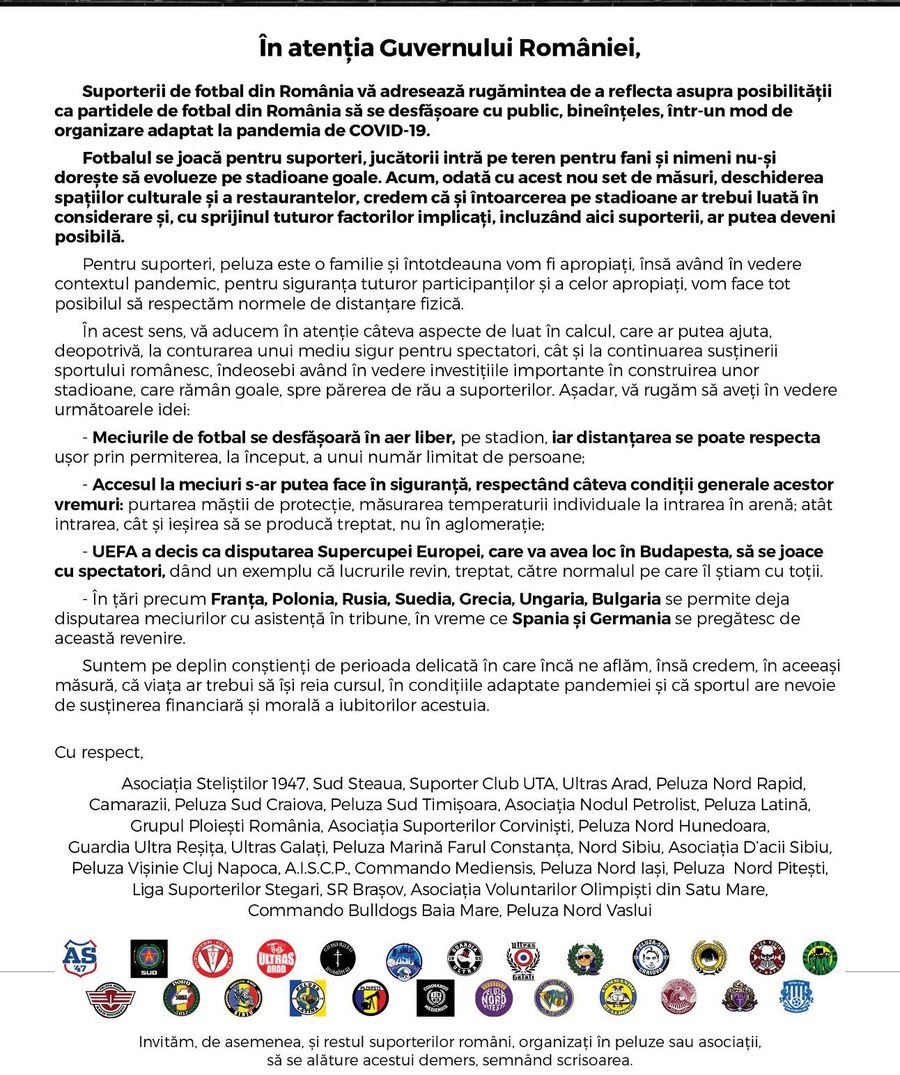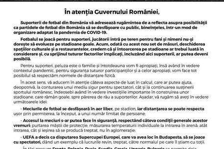 Suporterii de fotbal din România vă adresează rugămintea de a reflecta asupra posibilității ca partidele de fotbal din România să se desfășoare cu public, bineînțeles, într-un mod de organizare adaptat la pandemia de COVID-19.