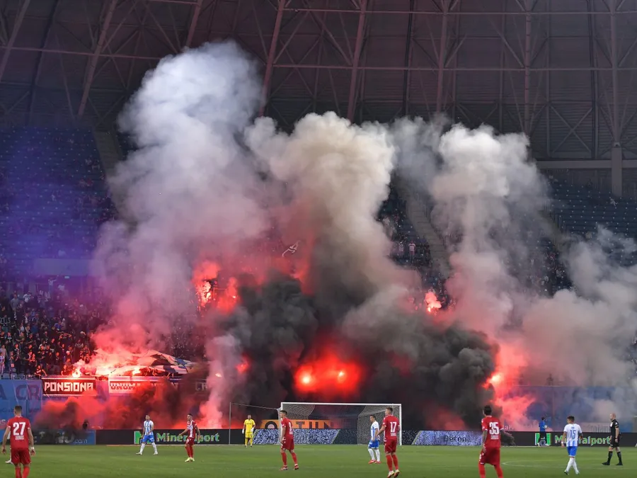 Min. 4: Fanii Universității opresc meciul pentru câteva minute, după ce câteva torțe ajung pe teren.