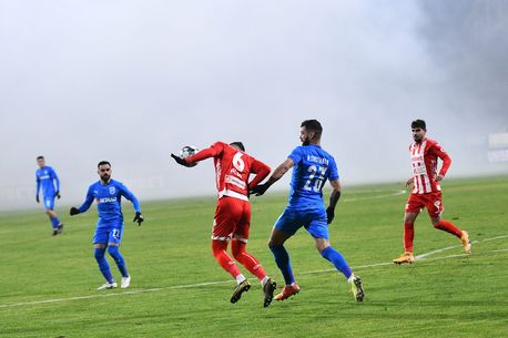 MIN 44. Marius Constantin și Mihai Bălașa se dau cap în cap, dar totul este în regulă. Cei doi jucători au continuat partida, fără să aibă nevoie de îngrijiri medicale.