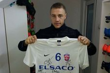 Mihai Dobre de la FC Bury. Tricoul este semnat de întreaga echipă. Foto Mihai Atomei