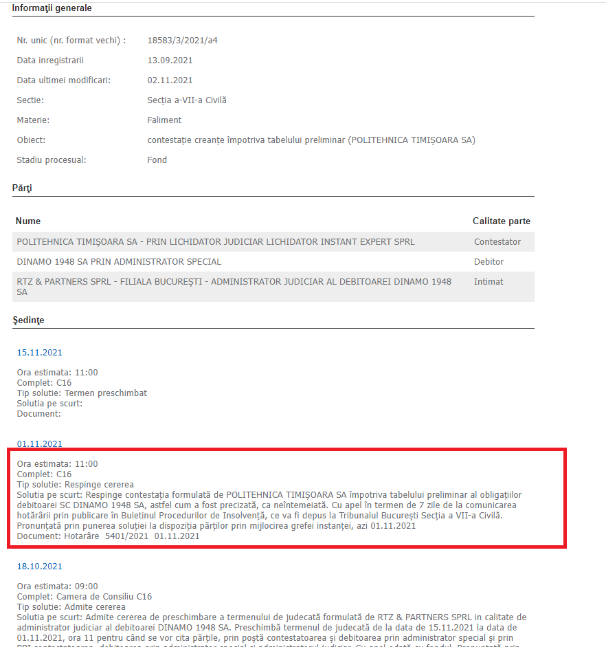 Astfel, Tribunalul București respinge cererea Politehnicii Timișoara de a se înscrie la masa credală, unde bănățenii sperau să obțină 1,1 milioane de euro