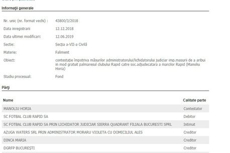 Horia Manoliu, președintele AFC Rapid (Liga 4), a contestat decizia lichidatorului Sierra Quadrant de a ceda și palmaresul clubului, împreună cu mărcile, către câștigătorul licitației de anul trecut. FC Rapid 1923 a intrat în posesia mărcilor plătind 407.000 euro plus TVA către lichidatorul „adevăratului Rapid”, clubul intrat în faliment în 2016. Horia Manoliu, președintele AFC Rapid și creditor la „adevăratul Rapid”, a reclamat că regulamentul privind licitația nu a fost aprobat de creditori și că, în textul anunțului oficial făcut de lichidator, nu scria nicăieri că se dă palmaresul împreună cu mărcile. În instanță a fost adus, ca probă, un interviu acordat ProSport de Mihai Florea, reprezentantul Sierra Quadrant, în care lichidatorul a subliniat, de mai multe ori, că nu va scoate la licitație palmaresul, explicând că acesta nu poate fi atribuit nimănui. Aici, interviul acordat de Mihai Florea pentru ProSport.