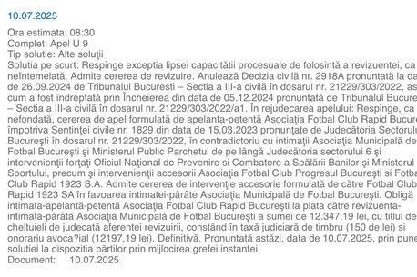 Veste extrem de importantă pentru Asociația Municipală de Fotbal București, care a obținut o victorie uriașă în procesul în care s-a cerut dizolvarea ei. Instanța a admis revizuirea față de hotărârea definitivă de dizolvare, dar și respingerea definitivă a solicitărilor de dizolvare a asociației.