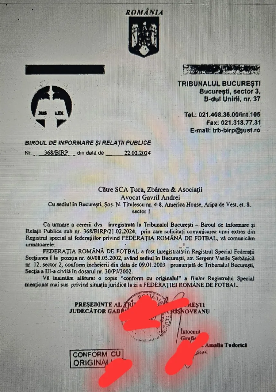 „Tribunalul București a decis astăzi, într-o primă etapă procesuală, respingerea unei cereri administrative a FRF de actualizare a unor informații dintr-un registru al Tribunalului București. Această decizie este nedefinitivă, FRF formulând deja apel ce va fi judecat de Curtea de Apel București, și oricum lipsită de autoritate de lucru judecat, fiindcă nu privește o dispută, un litigiu, ci o procedură administrativă (necontencioasă). Este lipsit de orice dubiu că FRF funcționează și a funcționat deplin legal. Orice persoană interesată poate verifica în mod simplu veridicitatea acestor afirmații, lecturând mențiunile din Registrul Federațiilor cu privire la Statutul FRF în vigoare, respectiv și mandatul Președintelui FRF. Dezinformările lansate în spațiul public privind “funcționarea ilegală a Federației”, “anularea mandatului Președintelui”.
