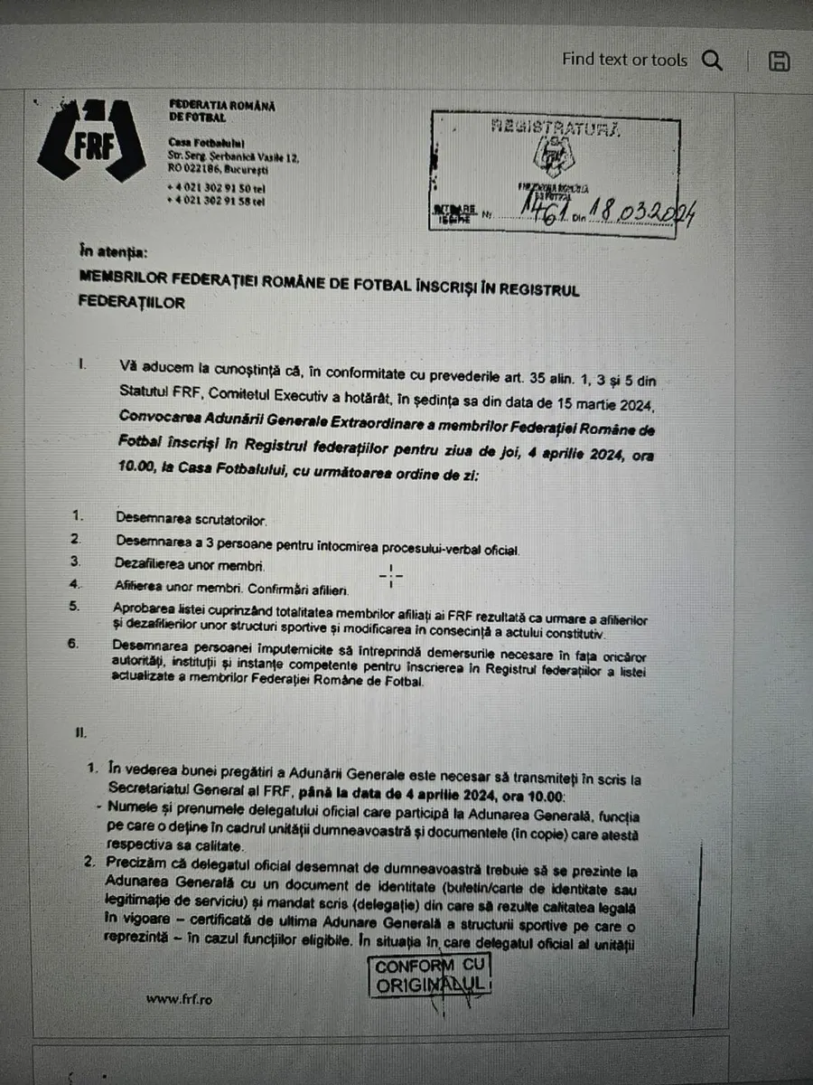 • „desemnarea persoanei împuternicite să întreprindă demersurile necesare în fața oricărei autorități, instituții și instanțe competente pentru înscrierea în Registrul federațiilor a listei actualizate a membrilor Federației Române de Fotbal”,