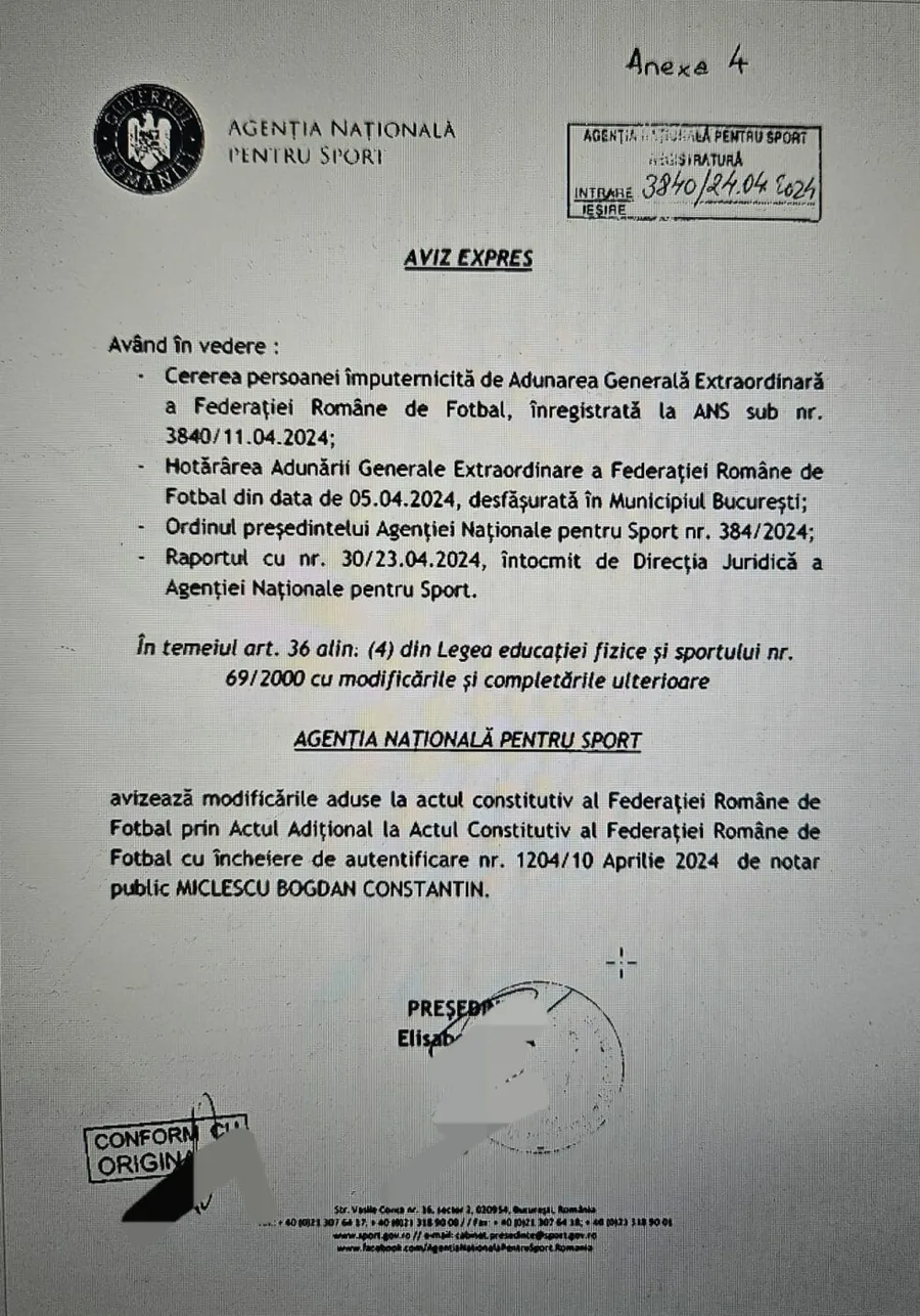 În data de 24.04.2024, Agenția Națională pentru Sport, sub semnătura Elisabetei Lipă, printr-un „Aviz Expres” și în baza cererii FRF din data de 11 aprilie, avizează modificările aduse actului constitutiv al FRF. Avea să fie următorul pas bifat în acțiunea oficialilor de la Casa Fotbalului.