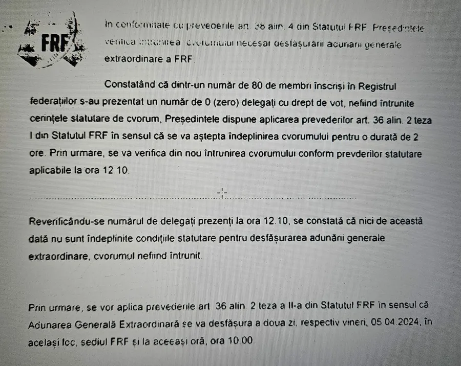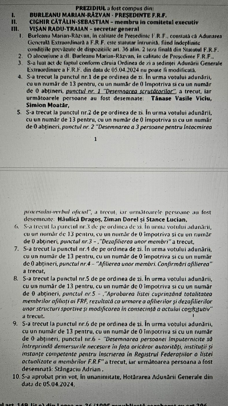 • „citirea hotărârii Adunării Generale Extraordinare a FRF din 5 Aplilie. Se aprobă cu unanimitate de voturi Hotărârea AGE a FRF din data de 5 Aprilie 2024”.