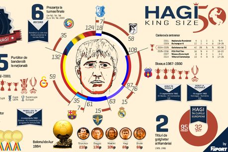 Pentru Hagi, acel moment chiar a reprezentat un punct de plecare. Ceea ce puteți vedea ilustrat în infografia de mai jos este o carieră-record, reper pentru fotbalul românesc. A mai fost ales de șapte ori cel mai bun jucător al României, a purtat de 65 de ori banderola de căpitan la echipa națională în 124 de selecții și a participat la șase turnee finale, trei de CM și alte trei de CE. Are în palmares la nivelul competițiilor inter-cluburi o Cupă UEFA și două Supercupe ale Europei, precum și multe alte recorduri pe care le puteți descoperi în inforgrafie.