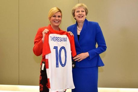 Kolinda Grabar-Kitarovic i-a înmânat Theresei May un tricou al Croației, cu doar câteva ore înainte ca naționala țării sale să elimine Anglia de la Cupa Mondială.