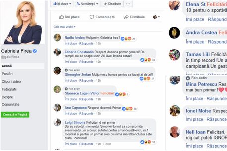 „Felicitări, doamna Firea! Nu-i băgați în seamă, o fac din răutate și pentru că atât îi duce capul” sau „Gestul urât a umbrit bucuria Simonei. Dar… asta e România. Dvs. v-ați făcut datoria” sunt două dintre mesajele repetate obsesiv de admiratorii Gabrielei Firea. Ca ele mai sunt și alte sute, în timp ce comentariile negative au fost „rase”.