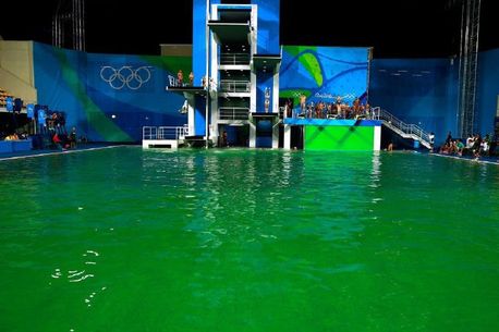 Cei prezenți la proba de sărituri au observat cu stupoare că în ziua de marți, 9 august, culoarea apei era diferită față de ziua precedentă. Dacă luni era albastră, culoarea obișnuită de la competiții, marți apa era de culoare verde, cromatică ce a stârnit ample controverse.