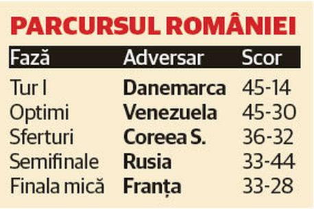 Primele două tururi au trecut fără nicio emoție. După 45-14 cu o reprezentantă a Danemarcei ce mai are foarte mult de învățat în acest sport, ne-am încălzit pentru sferturi cu Venezuela: 45-30. Și în primele opt am dat din nou peste Coreea de Sud. Asiaticele ne-au învins la ultimele două competiții (Jocurile Olimpice și Jocurile Universitare), mereu în faza sferturilor, și deveniseră un fel de piază-rea pentru Brânză&Co. Numai că ieri a fost ziua româncelor. Excelent orchestrate de pe margine de Octavian Zidaru, fetele noastre au condus în permanență duelul și s-au impus la final cu 36-32. O mică observație: înainte de Mondiale, Coreea a vrut să se pregătească din nou în compania fetelor noastre, la fel ca înainte de Londra. Dacă atunci am acceptat, anul acesta le-am refuzat! Revanșa era luată, dar medalia nu era asigurată.