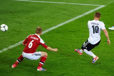 Nu a mai putut Gomez, dar s-a remarcat Podolski. Vârful de 27 de ani cumpărat vara asta de Arsenal a deschis scorul în minutul 19, sărbătorind astfel atingerea cifrei de 100 de selecții la națională. După o serie de ratări uriașe ale lui Muller și Khedira, danezilor le-a revenit ambiția din 1992 și au reușit să egaleze prin Krohn-Dehli (24). Momentul de slăbiciune al nemților din minutul 24 poate fi explicat simplu. Joachim Low a trimis pe teren aseară cea mai tânără selecționată din istoria Germaniei, la un turneu final, cu o medie de vârstă de 25 de ani și 107 zile. Vestea că „dincolo” Ronaldo reușise, în sfârșit, să marcheze pentru 1-1 și 2-1 contra Olandei i-a pus la treabă și mai mult pe nordici, însă ce poți face când Hummels și Badstuber nu greșesc mai mult de o dată pe repriză? Nimic, se pare, pentru că Lars Bender i-a prins pe contraatac și a înscris pentru 2-1 în minutul 80.