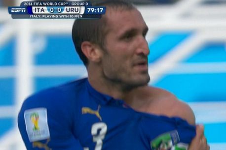 În minutul 79, Suarez l-a mușcat de umăr pe stoperul italian, care apoi și-a tras tricoul pentru a arăta semnul acestei mușcături.