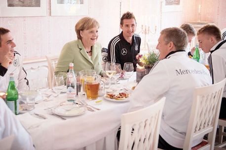 Partida cu Grecia este primul meci de la EURO 2012 la care participă liderul german, care i-a vizitat însă pe Lahm&Co.în cantonamentul de la Gdansk, cu câteva zile înainte de debutul turneului. Pentru germani, Merkel este un port-bonheur. Cancelarul a mai asistat live la masacrul Argentinei în sferturile CM 2010, un 4-0 la Cape Town, și la victoria împotriva Turciei, 3-0 la Berlin (octombrie 2010), în preliminariile CE 2012.