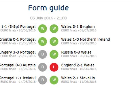 Fără prea mare importanță la un meci cu o asemenea încărcătură, statistica este totuși favorabilă echipei pregătite de Fernando Santos. Semifinala EURO ar fi a patra întâlnire directă între Portugalia și Țara Galilor, prima în ultimii 16 ani, după ce în iunie 2000 lusitanii au învins cu 3-0 într-un meci amical. De altfel, toate cele trei meciuri de până acum au fost amicale. Portugalia este neînvinsă în ultimele 12 partide oficiale, în timp ce Țara Galilor se laudă cu faptul că a pierdut doar două din cele 10 meciuri disputate la turneele finale.
