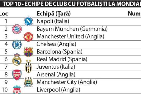 Interesant este că, dintre fotbaliștii napoletanilor prezenți la Cupa Mondială, trei fac parte din naționala Elveției, iar din echipa Italiei – numai unul singur. Formația antrenată de Rafael Benitez este urmată de mari forțe ale fotbalului mondial: Bayern München, Chelsea Londra și Manchester United, cu câte 14 jucători la Cupa Mondială. Campionatul Angliei mai mizează pe Manchester City, Arsenal și Liverpool, cele trei echipe având câte 11 jucători la turneul final.