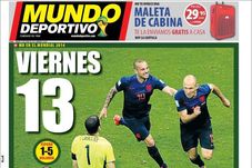 El Mundo Deportivo, ziarul de sport din Barcelona, dă o tentă superstițioasă înfrângerii în fața Olandei. „Vineri, 13”, este titlul de primă pagină din Catalunia. „La Roja a primit o mână de goluri de la o echipă a Olandei care s-a răzbunat pentru finala din Africa de Sud”.