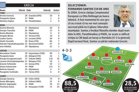 Grecia este echipa care a interzis românilor prezența la Cupa Mondială din Brazilia, după ce a trecut cu scorul general de 4-2 de „tricolorii” lui Pițurcă. Campioana europeană din 2004 s-a calificat, astfel, la al treilea turneu final din istorie, dar la niciuna dintre ediții nu a reușit să treacă de faza grupelor. Naționala elenă se bazează pe experiența lui Giorgos Samaras, pe explozia lui Mitroglou și pe forța defensivă a echipei. Însă vedeta grecilor este, de departe, Mitroglou. Atacantul celor de la Fulham a jucat doar 153 de minute în Premier League, din ianuarie, dar a arătat o formă foarte bună la baraj, atunci când a marcat de trei ori contra României. Au înscris doar 12 goluri în preliminarii și au primit 4, fiind o echipă care pune accent pe apărare, nu pe atac. Santos, antrenorul naționalei, folosește ca sistem de joc fie 4-5-1, fie 4-3-3. La fel ca predecesorul său, Otto Rehhagel, Fernando Santos știe însă cum să își așeze jucătorii în teren pentru a maximiza potențialul acestora. Selecționerul portughez își cunoaște foarte bine echipa și a reușit să realizeze și un schimb de generații din mers, aducând rezultate în timp ce a promovat jucători tineri. Indiferent de lotul pe care îl are la dispoziție, Grecia poate îndeplini întotdeauna calitatea de echipă-surpriză.