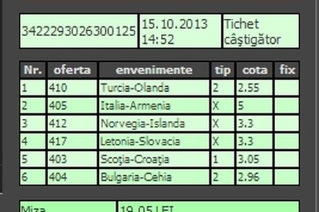 Cu toate că biletul avea o dificultate mare de reușită, miza a fost de 19 lei. Cele 6 meciuri pariate: