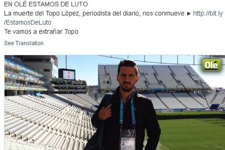 Guillem Balague, cel care a scris cărțile autobiografice ale lui Messi, Guardiola și Rafa Benitez, a anunțat pe contul său de Twitter faptul că jurnalistul argentinian Jorge Topo Lopez a murit la vârsta de 38 de ani într-un accident de mașină petrecut azi noapte la Sao Paulo, orașul semifinalei Argentina – Olanda. Taxiul cu care Lopez se întorcea la hotel a fost lovit de o mașină furată în care se aflau trei tineri brazilieni delicvenți care fugeau de poliție. Mașina în care se afla jurnalistul s-a dat peste cap și a intrat într-un stâlp. Șoferul a suferit doar o leziune la umăr.