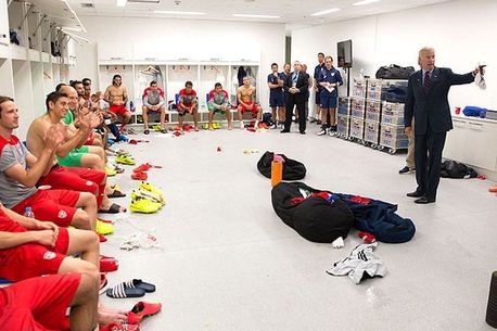 Vicepreședintele SUA a fost aplaudat de fotbaliștii selecționatei de fotbal a SUA după ce a ținut un scurt discurs în vestiar, la finalul meciului câștigat cu Ghana. Foto: Folha de Sao Paulo
