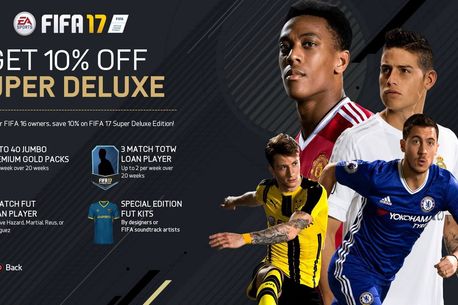 Și pentru că din niciun anunț oficial nu poate lipsi o veste legată de precomenzi, pasionații de FIFA ce vor plasa acum un pre-order pentru FIFA 17 Super Deluxe Edition urmează să primească 40 de FIFA Ultimate Team Jumbo Premium Gold Packs, jucători împrumut din Team of The Week, precum și conținut suplimentar pentru modul de joc FIFA Ultimate Team.