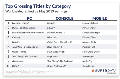 League of Legends rămâne cel mai profitabil joc pentru PC și în mai 2019, în timp ce, pe console, FIFA 19 își dispută supremația cu recentul Mortal Kombat 11.
