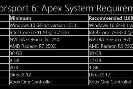 Și, dacă tot a venit vorba de framerate, Microsoft a dezvăluit și cerințele de sistem necesare pentru a rula Forza Motorsport 6: Apex; le puteți consulta în imaginea următoare: