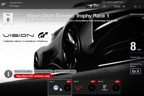Modul single player GT League va primi la rândul său trei probe noi: Stars & Stripes (în Beginner League), Vision Gran Turismo Trophy (în Amateur League) și F1500 Championship (în Professional League).