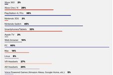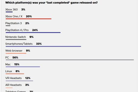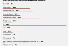 La întrebarea referitoare la cea mai interesantă platformă pentru dezvoltatorii de jocuri, PC-ul s-a detașat din nou, cu 60% dintre opțiuni, locul secund fiind ocupat de această dată de Nintendo Switch, cu un procentaj respectabil de 45%, PS4 completând podiumul cu 38% dintre voturile participanților.