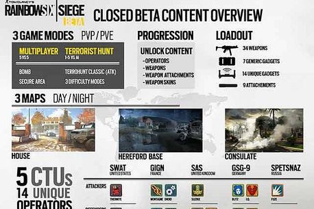Astfel, beta-ul pentru Rainbow Six: Siege oferă acces la două moduri de joc multiplayer 5 vs. 5 (Bomb, Secure Area), precum și la modul de joc împotriva AI-ului Terrorist Hunt Classic (cu trei niveluri de dificultate). Beta-ul include trei hărți (House, Hereford Base și Consulate), cu versiuni pe timp de zi și de noapte, precum și 14 operatori cu propriile abilități. Nu lipsesc nici 34 de arme, 21 de gadget-uri (dintre care 14 unice), precum și nouă atașamente pentru arme.