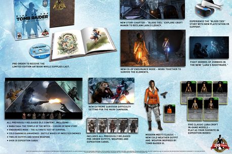 Pachetului Rise of The Tomb Raider: 20 Year Celebration va oferi, pe lângă jocul inițial, toate DLC-urile lansate deja, dar și un nou capitol de poveste: „Blood Ties”, în care Lara va fi nevoită să exploreze conacul familiei Croft pentru a găsi dovezi conform cărora acesta îi aparține de drept. După finalizarea acestui capitol, se va debloca modul „Lara”s Nightmare”, în care Lara va lupta împotriva morților vii în conacul familiei Croft. „Blood Ties” va putea fi jucat și în mod VR cu ajutorul headset-ului PlayStation VR.