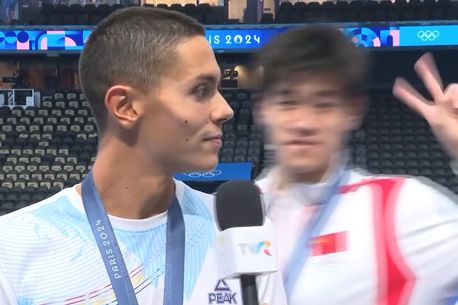 Dublu medaliat la Jocurile Oliompice de la Paris, înotătorul David Popovici dădea un interviu în direct, când chinezul Zhanle Pan a trecut prin spatele lui și a făcut o glumă.