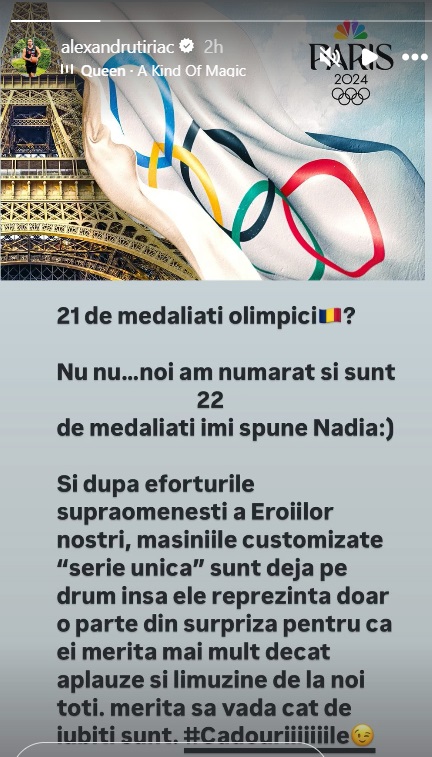Ulterior, Alexandru Țiriac a revenit și a anunțat că toți medaliații vor primi mașini. „21 de medaliați olimpici? Nu, nu… noi am numărat și sunt 22 de medaliați, îmi spune Nadia”, a anunțat Ion Alexandru Țiriac pe contul său de Instagram.