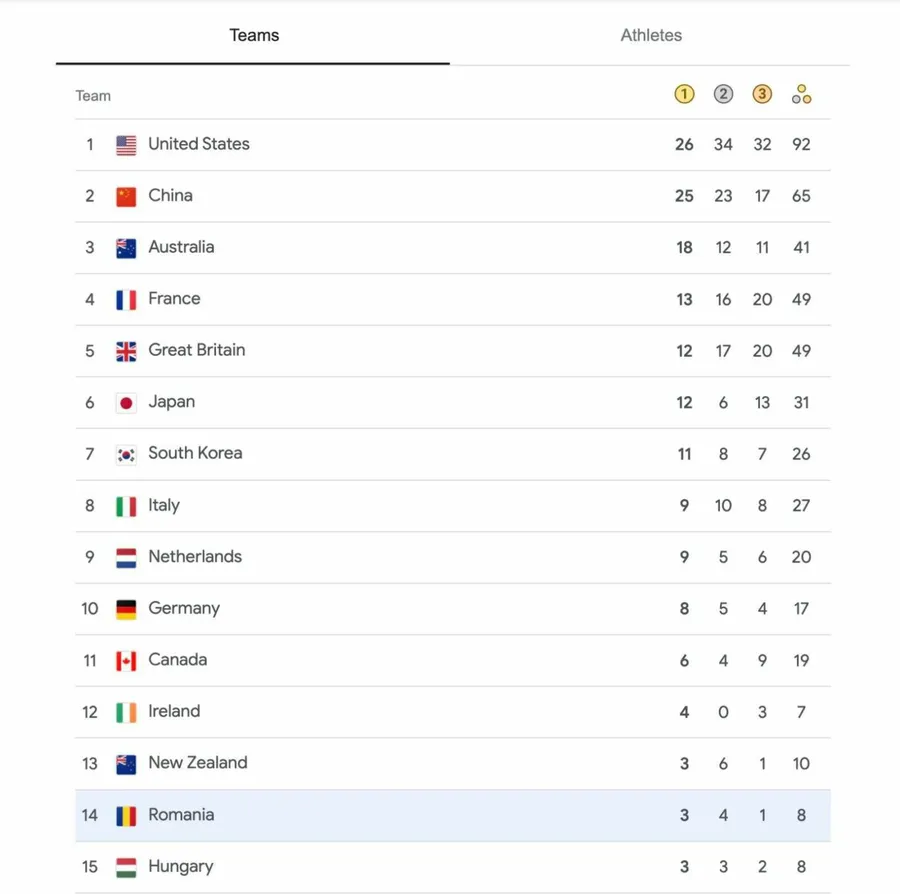Mihaela Cambei a câştigat medalia de argint în proba de haltere de la Olimpiadă, la categoria 49 kilograme. Medalia obținută de sportiva noastră saltă delegația României cu un loc, până pe 14, în clasmentul pe medalii, cu o poziție peste vecina Ungaria. Podiumul este compus din SUA – 26 de medalii de aur, China – 25 de medalii de aur și Australia – 18 medalii de aur.