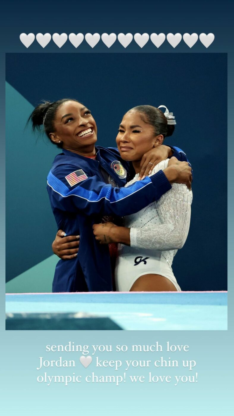 Îți transmit multă dragoste, Jordan. Ține capul sus, campioană olimpică! Te iubim”, i-a transmis Simone Biles lui Chiles, prin intermediul unei postări pe care a realizat-o pe Instagram.