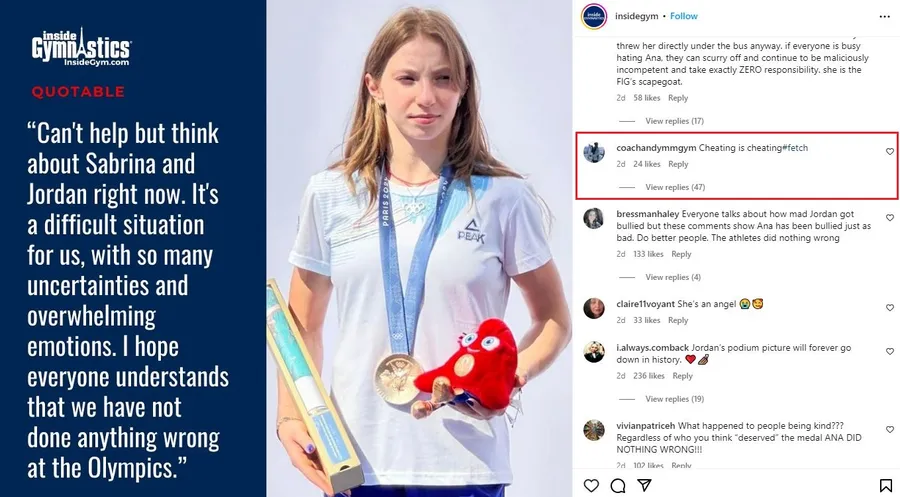 Pe pagina de Instagram denumită InsideGym, la o postare în care a fost prezentată o scurtă declarație a Anei Bărbosu după ce și-a recuperat medalia, Andy Memmel a atacat-o pe româncă și a spus: