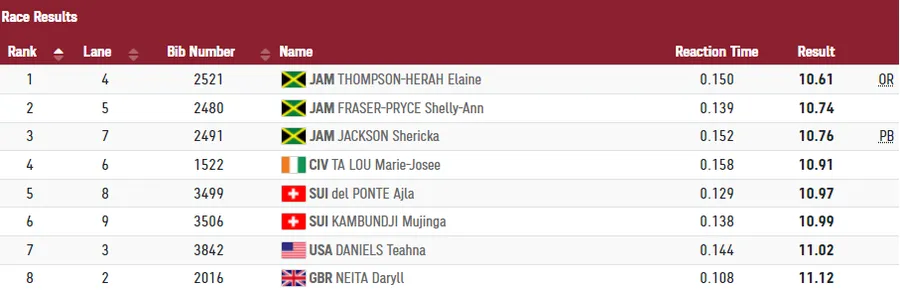 Jamaica a pus monopol pe întreg podiumul de premiere. Shelly-Ann Fraser-Pryce a trecut linia de sosire după 10.74 secunde, iar Shericka Jackson a fost a treia, cu 10.76. De remarcat faptul că noua campioană maximă a atins o viteză maximă de aproape 40 km / h.