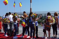 La ceremonia de la Salonul Oficial al Aeroportului Henri Coandă, Lipă i-a chemat pe toţi sportivii din lotul de canotaj să vină alături de ea şi le-a mulţumit.