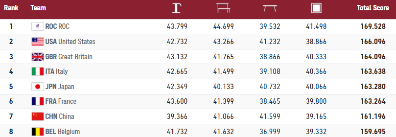 După această evoluție, starul american s-a retras din concurs, iar Statele Unite au dus concursul până la final cu aceleași trei gimnaste. Fără Simone Biles, echipa nu a putut să depășească Rusia, care a luat un avans de un punct chiar după primul aparat. Și în condițiile în care două rusoaice din trei au ratat la bârnă.