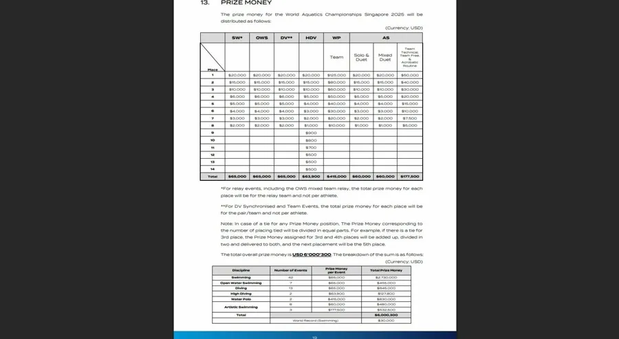 Exceptând bonusurile de 30.000 de dolari acordate pentru stabilirea unor noi recorduri mondiale, bugetul total de premii de la competițiile de înot se ridică la 2.730.000 de dolari. În total vor fi 42 de probe.