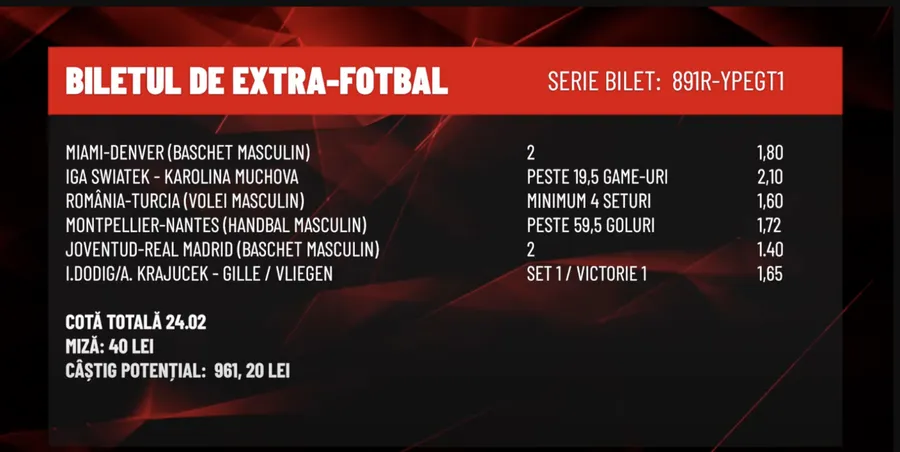 Printre ele se numără partida dintre Miami și Denver, la baschet masculin, unde Daniel Nazare a ales să mizeze pe oaspeți, dar și meciul de tenis dintre Iga Swiatek și Karolina Muchova, unde s-a mers pe peste 19,5 game-uri.