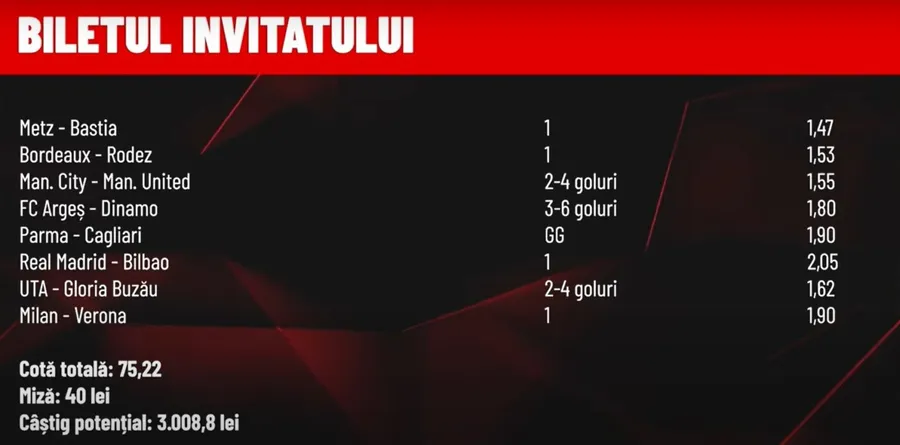 „Am primul meci Metz cu Bastia, am luat aici 1 solist, am mers pe mâna celor de la Metz. La fel, Bordeaux, amândouă sunt echipe care trebuie să câștige neapărat. Am luat pe Manchester City cu Manchester United 2-4 goluri, finala Cupei Angliei. Apoi, 3-6 goluri (n.r. la FC Argeș – Dinamo), am mers și aici pe goluri, FC Argeș e echipa care trebuie să joace, să marcheze cât mai multe goluri. M-am gândit și la Dinamo, pe contraatac poate să marcheze, tocmai de asta am mers pe goluri. Aș fi vrut să merg pe mâna celor de la FC Argeș, dar, după ce am văzut în meciul tur, mi-a fost frică să îi iau așa.