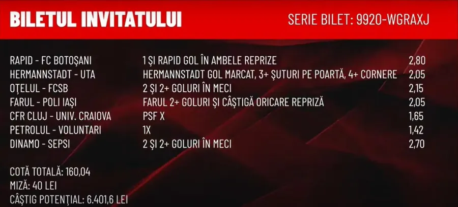 „Rapid, am luat 1 și Rapid dă gol în ambele reprize, e de la super-pariuri, 2,80 cotă. La Hermannstadt cu UTA, am luat Hermannstadt gol marcat, șuturi pe poartă și cornere, Hermannstadt va avea trei șuturi pe poartă, Hermannstadt va avea patru cornere. Mie nu mi se pare greu.