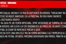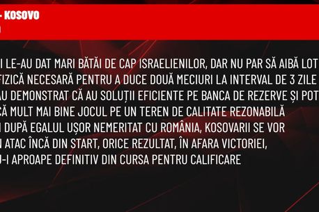 – frustrați după egalul ușor nemeritat cu România, kosovarii se vor arunca în atac încă din start, orice rezultat, în afara victoriei, scoțându-i aproape definitiv din cursa pentru calificare
