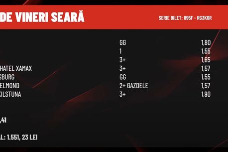 Liviu Chiriță, omul care recent a câștigat nu mai puțin de 165.000 de euro cu un bilet absolut fabulos, cu o miză de numai 38 de lei, a alcătuit un bilet cu 7 evenimente desfășurate exclusiv în seara de vineri, 12 mai, evenimente care au generat o cotă totală de 33,41.