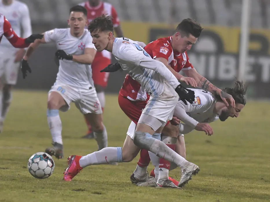 Octavian George Popescu, Steliano Filip si Ante Vukusic la faza eliminarii dinamovistului in meciul de fotbal dintre Dinamo Bucuresti si FCSB, contand pentru Liga 1 Casa Pariurilor, desfasurat fara spectatori pe Stadionul Dinamo din Bucuresti, miercuri 3 februarie 2021. © FOTO:Razvan Pasarica/SPORT PICTURES