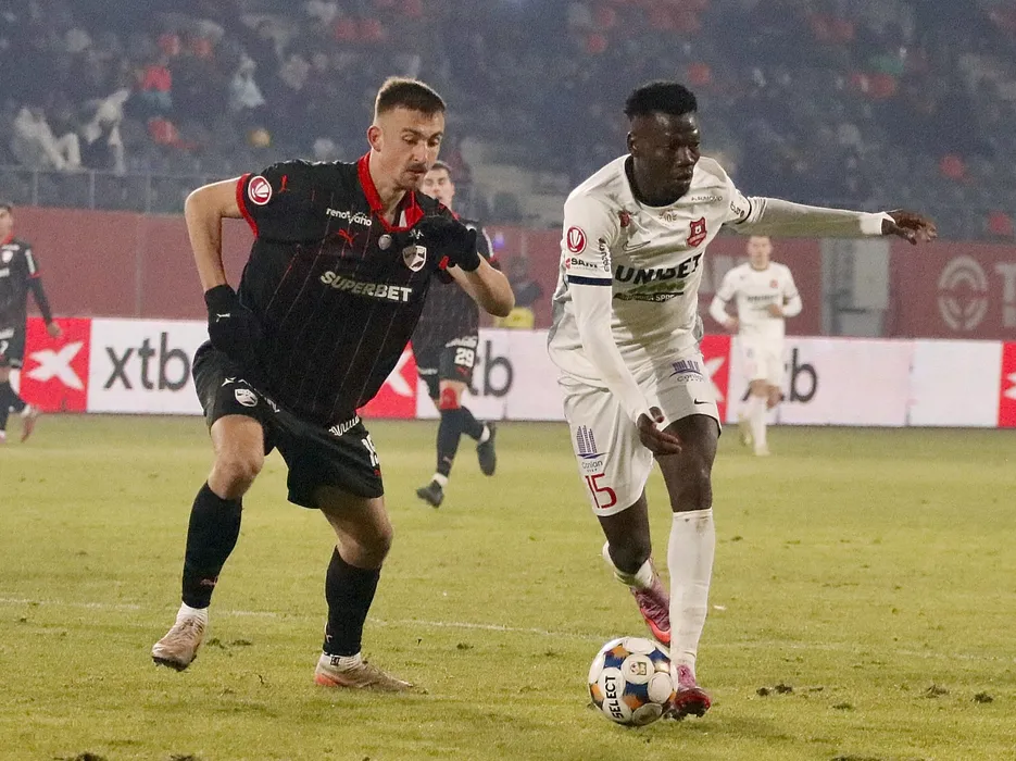 Christ Afalna Nkama si Nikita Stoinov in meciul de fotbal dintre AFC Hermannstadt Sibiu si Dinamo Bucuresti, contand pentru Superliga Superbet, desfasurat pe Stadionul Municipal din Sibiu, vineri 23 ianuarie 2026. © FOTO:Valentin Macrea/SPORT PICTURES