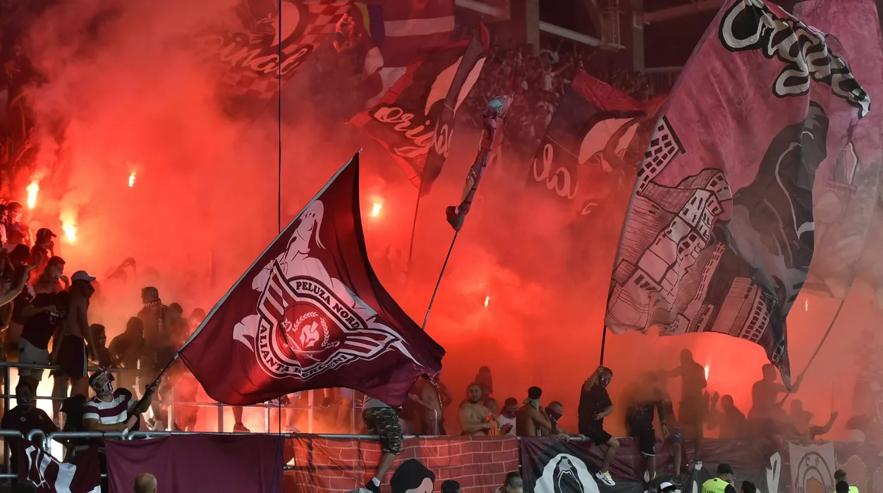 Suporterii rapidisti cu steaguri si fumigene in galerie la meciul de fotbal dintre Rapid Bucuresti si UTA Arad, contand pentru Superliga Superbet, desfasurat pe Stadionul Rapid Giulesti din Bucuresti, sambata 20 august 2022. © FOTO:Razvan Pasarica/SPORT PICTURES
